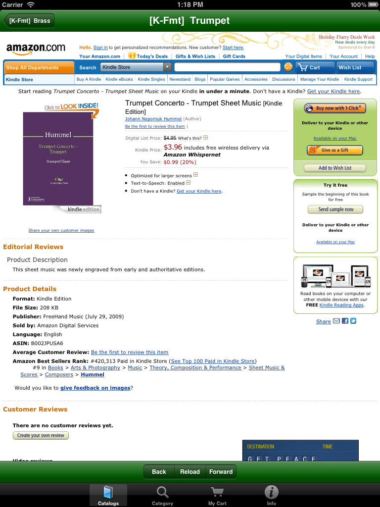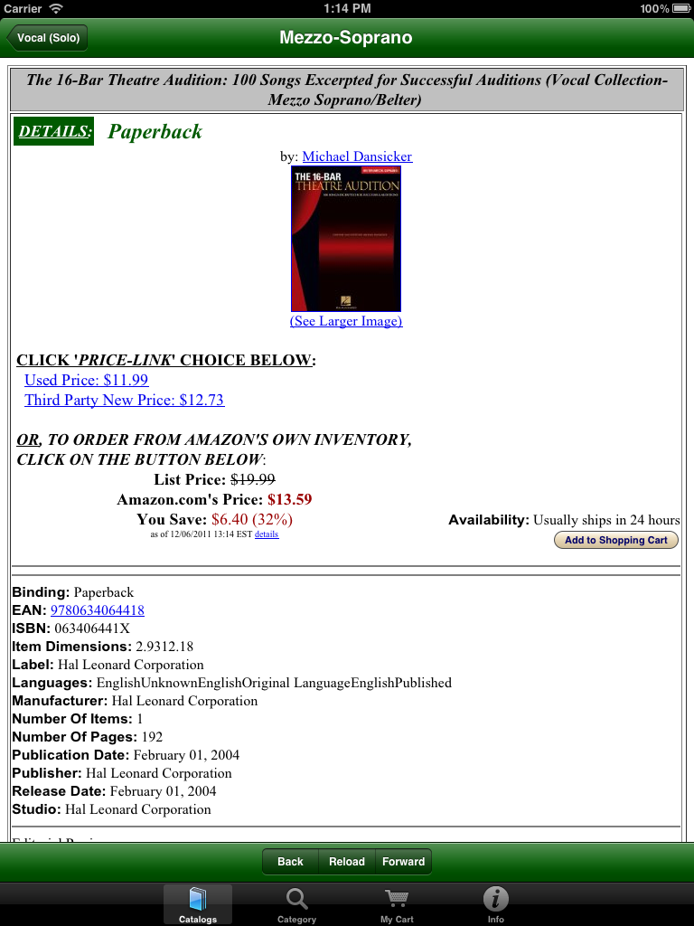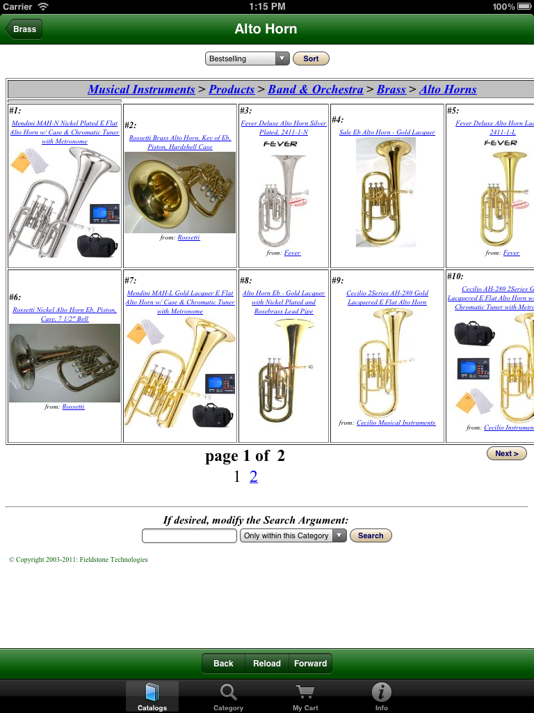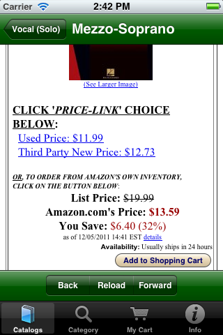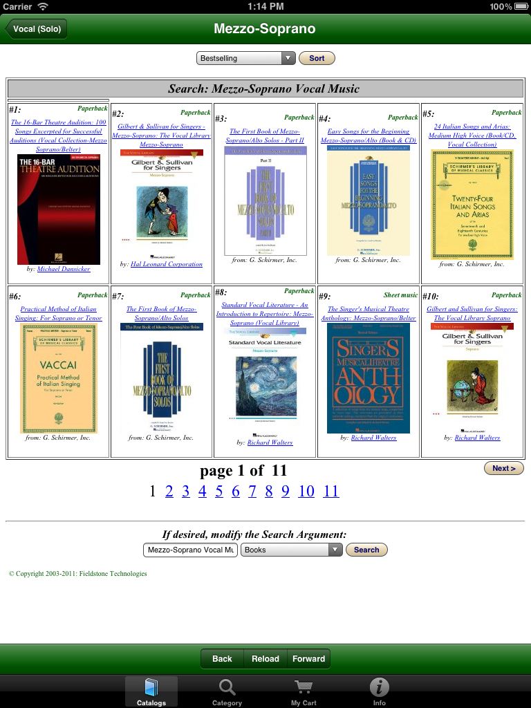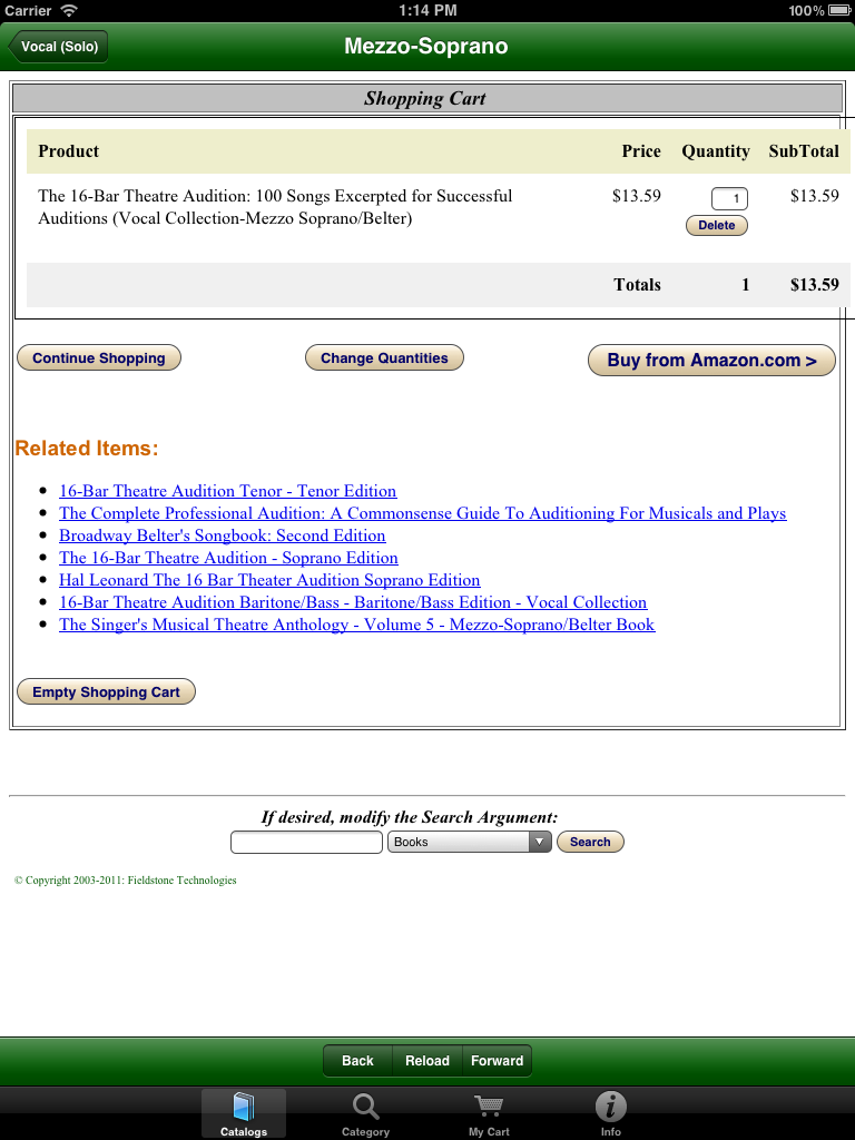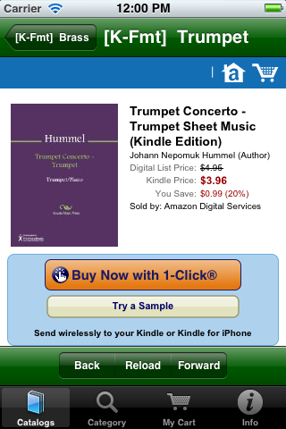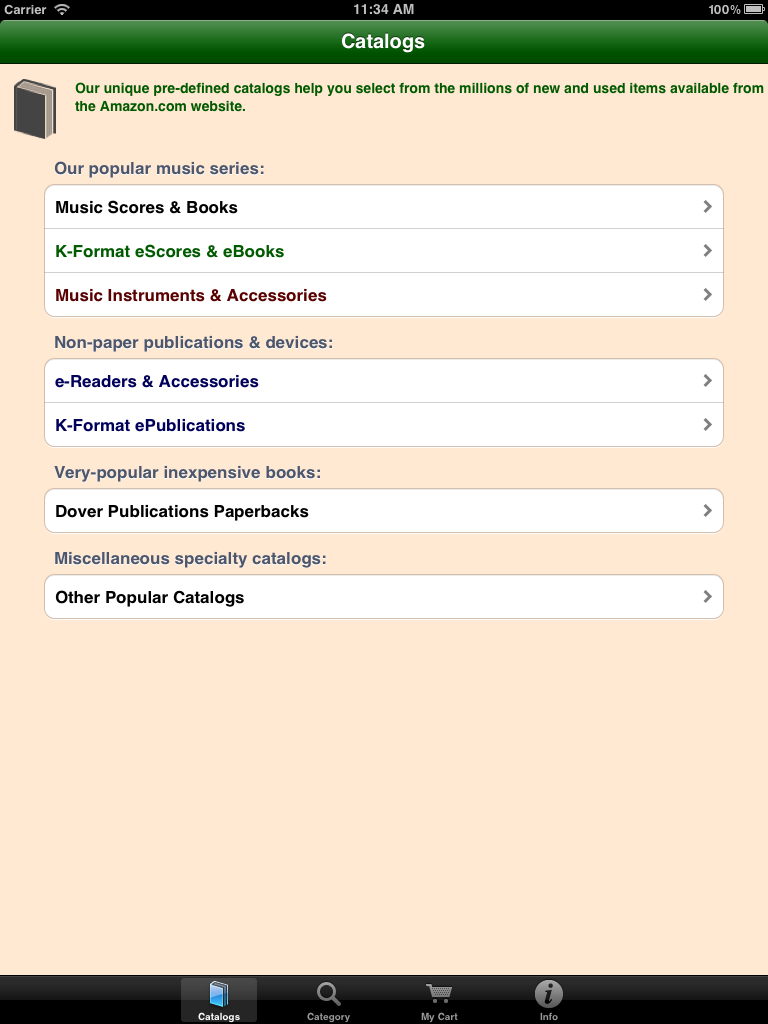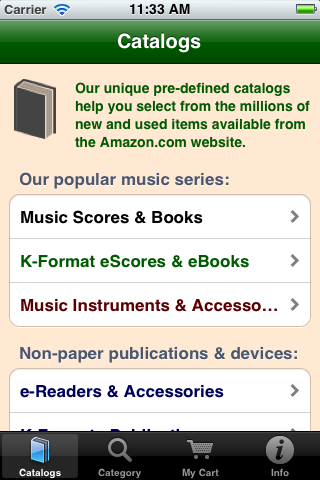 Use our unique free app to help choose from the millions of new and used items available online from both Amazon and their thousands of affiliated suppliers. As a Canadian user commented about our app when giving it a Five-Star Rating: "This is THE BEST mobile buying app! (It never froze on my device and it is VERY useful! This is THE best app on the market for buying! You will enjoy it!") For over thirteen years our 'Fieldstone Music' division has been providing innovative internet-based shopping experiences. Because we are an 'Authorized Amazon Associate', our software retrieves current data directly from Amazon's extensive internet servers in microseconds using their 'Amazon Web Services'. Our unique picture-oriented displays help you find things quickly and are now available in both a phone-sized version and in a new bigger-display version for tablets. Besides general shopping at Amazon, one of the major aims of this app is to ease the musical shopping needs of performance musicians -- ranging from curious beginners to professionals seeking specific musical scores or instrument accessories. We are also performing musicians, so we used our prior knowledge of the field to pre-define relevant specific sub-categories of interest so that our software can quickly fetch only relevant items. For example, in our music catalogs you can quickly find organ or woodwind scores, books on instrument playing techniques, easy guitar music, vocal duet scores, etc. Newly added pre-defined catalogs also provide for easy selections of newly available electronic-format publications, and can help you find appropriate e-Reader devices. For musicians, we've also added catalogs to help find electronic-format music books and scores. Also added are new catalogs to help you choose student-level or professional musical instruments and related accessories. Because literally thousands of independent suppliers participate in this vast online marketplace, you can usually find out-of-print books and musical scores or slightly used editions offered at bargain prices. Whether you choose to purchase an item directly from Amazon's own inventory, or instead from one of its participating Authorized Resellers, all of the final checkout and order fulfillment activities are supervised by Amazon itself. In addition to using one of our many pre-defined catalogs, you easily can modify a search argument with a few keystrokes to do even more precise searches. You also can search for ANYTHING on the Amazon marketplace using our 'Category Searches' feature and you can modify those search arguments as well. More detailed instructions are always available right on your device by tapping the 'Info' icon on the screen. |